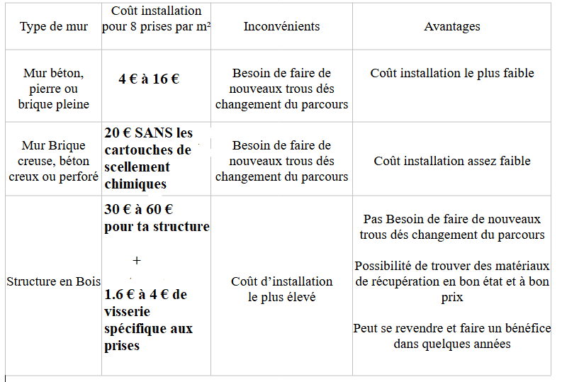 Si tu pars sur 8 prises par m², voici ce que cela te coûte en termes de fixation suivant ta structure...